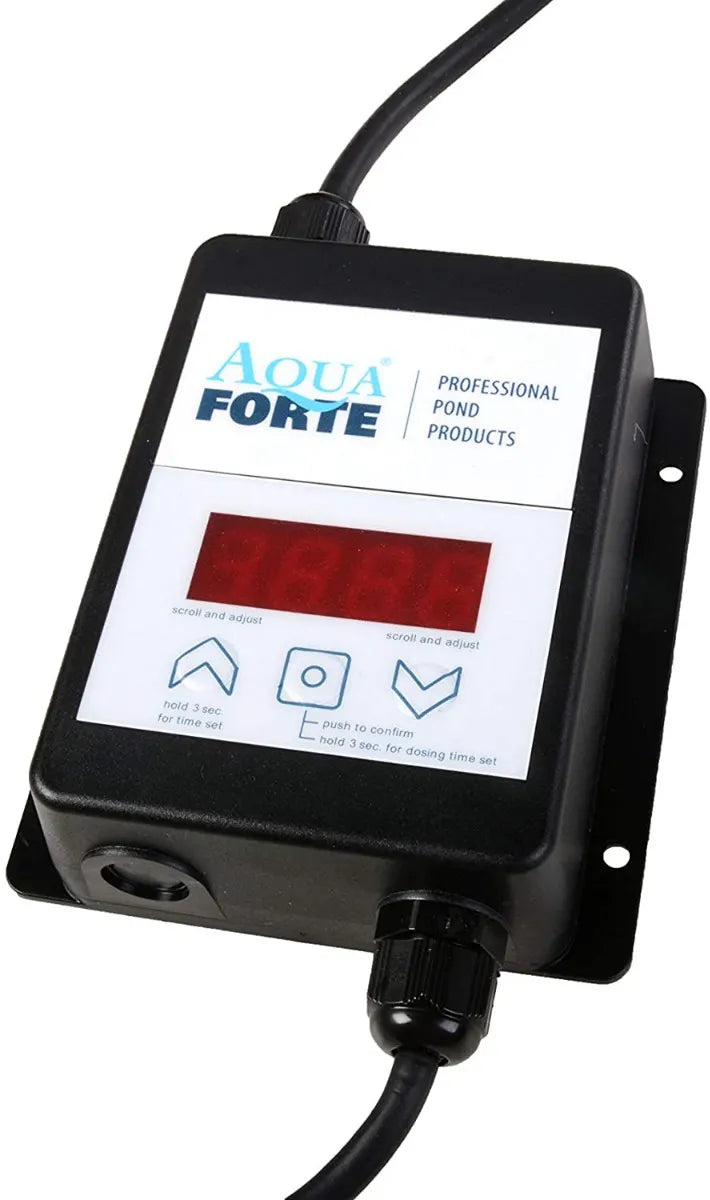 The AquaForte Automatic Fish Feeder with programmable timer will carry out fully automatic feeding between 1 and 24 times a day. The quantity of feed can be set by adjusting the number of dosing seconds per hour, the number of dosing seconds per hour can be set between 0 and 600 seconds.