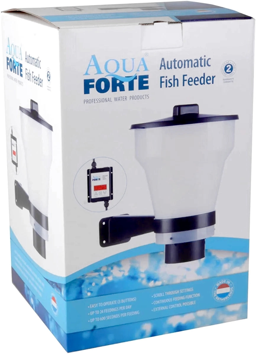 The AquaForte Automatic Fish Feeder is suited for pellets sizes 2 to 9 mm and comes with adaptor ring for pellets smaller than 4 mm, mounting bracket, 10 meters of cable and holds up to 7 liters of food.
