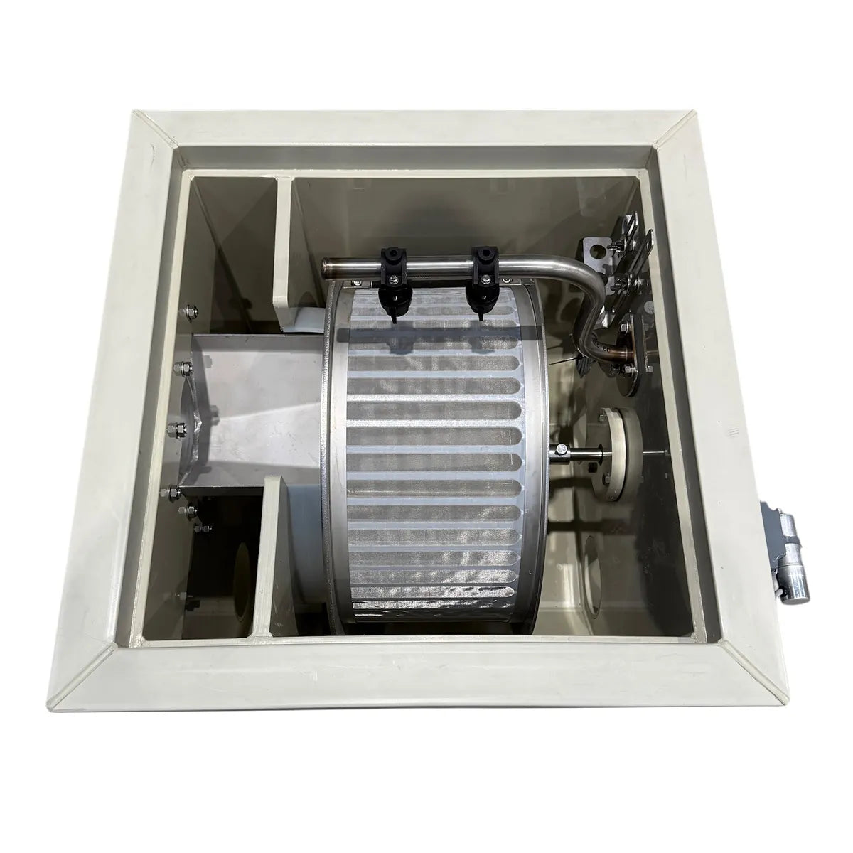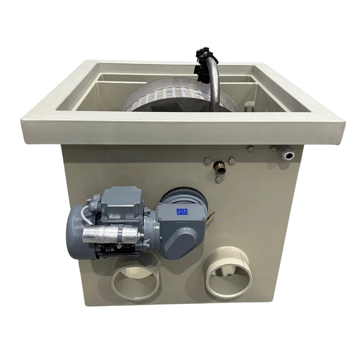 ProfiDrum Eco 45/20 Specifications: 70cm L x 60cm W x 54cm H, 2 x 110mm inlets, 2 x 110mm outlets, 1 x 110mm waste, Maximum flow rate of 15,000 litres per hour.